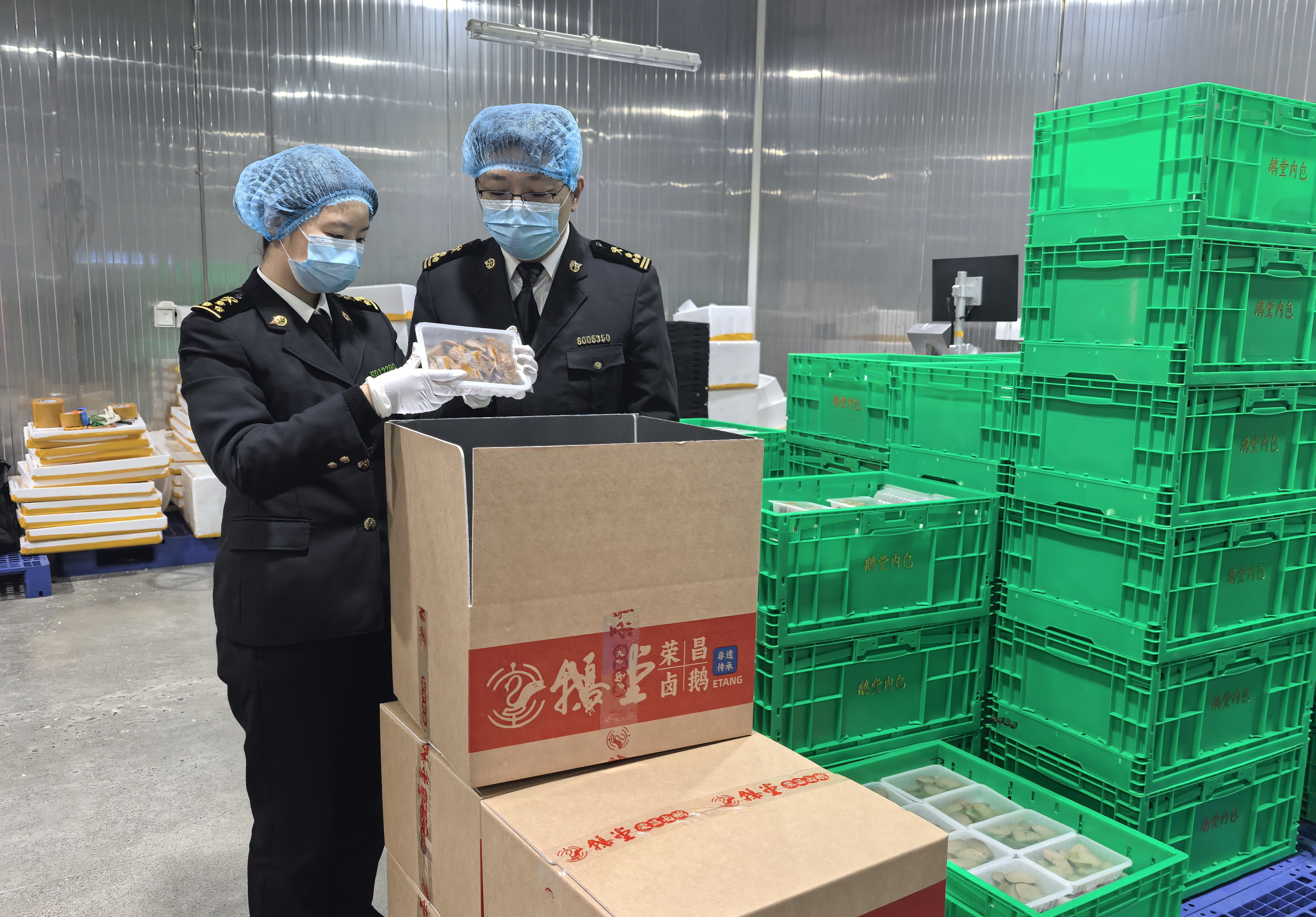 海关关员对出口的荣昌卤鹅开展现场监管。