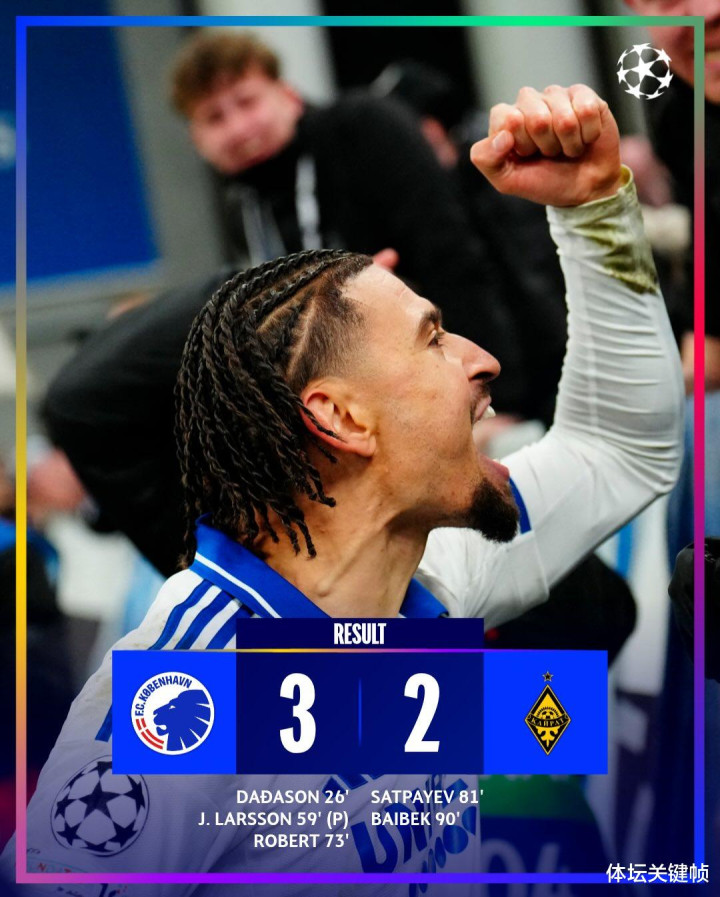 维克托・达达松成为欧冠正赛中首位在多场比赛中进球的最年轻球员,哥本哈根斩获本赛季首胜。这位 17 岁小将头球破门,打破了拉明・亚马尔保持的纪录;下半场重启后不久,阿拉木图凯拉特的叶尔金・塔帕洛夫的凌空抽射击中横梁。