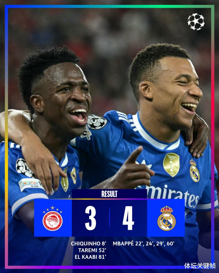 姆巴佩上演大四喜(其中包含欧冠历史第二快帽子戏法),帮助皇马在比雷埃夫斯惊险取胜。比赛第 8 分钟,奥林匹亚科斯通过精妙配合由奇奎尼奥冷静推射破门取得领先;随后在临近半小时时,姆巴佩在 6 分 42 秒内连入三球完成反超。