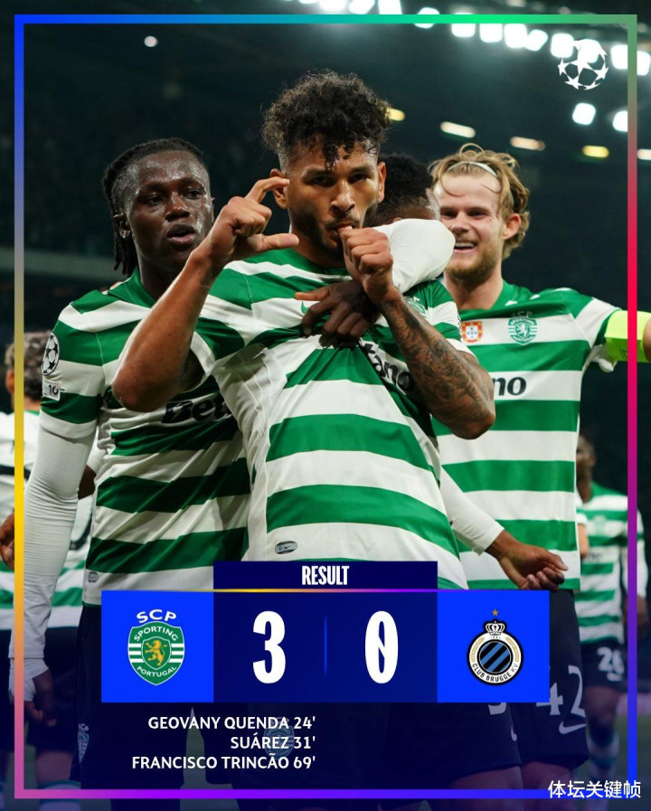 葡萄牙体育在里斯本凭借高效表现完胜布鲁日,延续了联赛阶段主场全胜的纪录(3 胜)。比赛上半场,热尼・卡塔莫贡献两次助攻,帮助球队以 2-0 领先:第 24 分钟,若昂・昆达转身射门得分;七分钟后,路易斯・苏亚雷斯接精妙直塞球挑射破门。