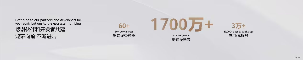 在今天的活动上,华为官方披露了最新鸿蒙用户数据,宣布 HarmonyOS5 终端设备数量突破 1700 万台,支持开源鸿蒙兼容软硬件产品超 1300 款。